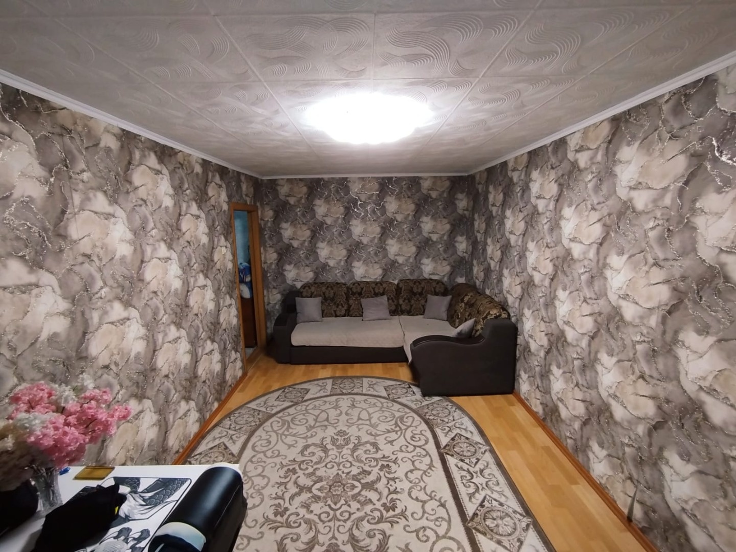 Потолок-по всей квартире поклеен потолочной плиткой,